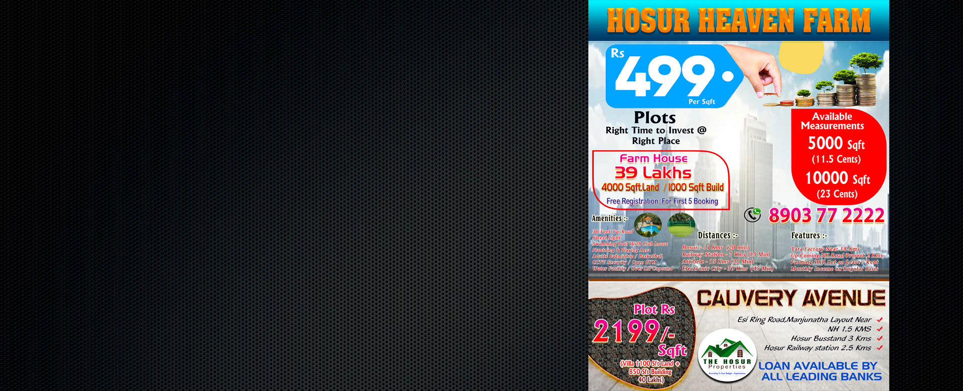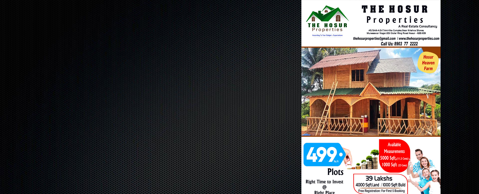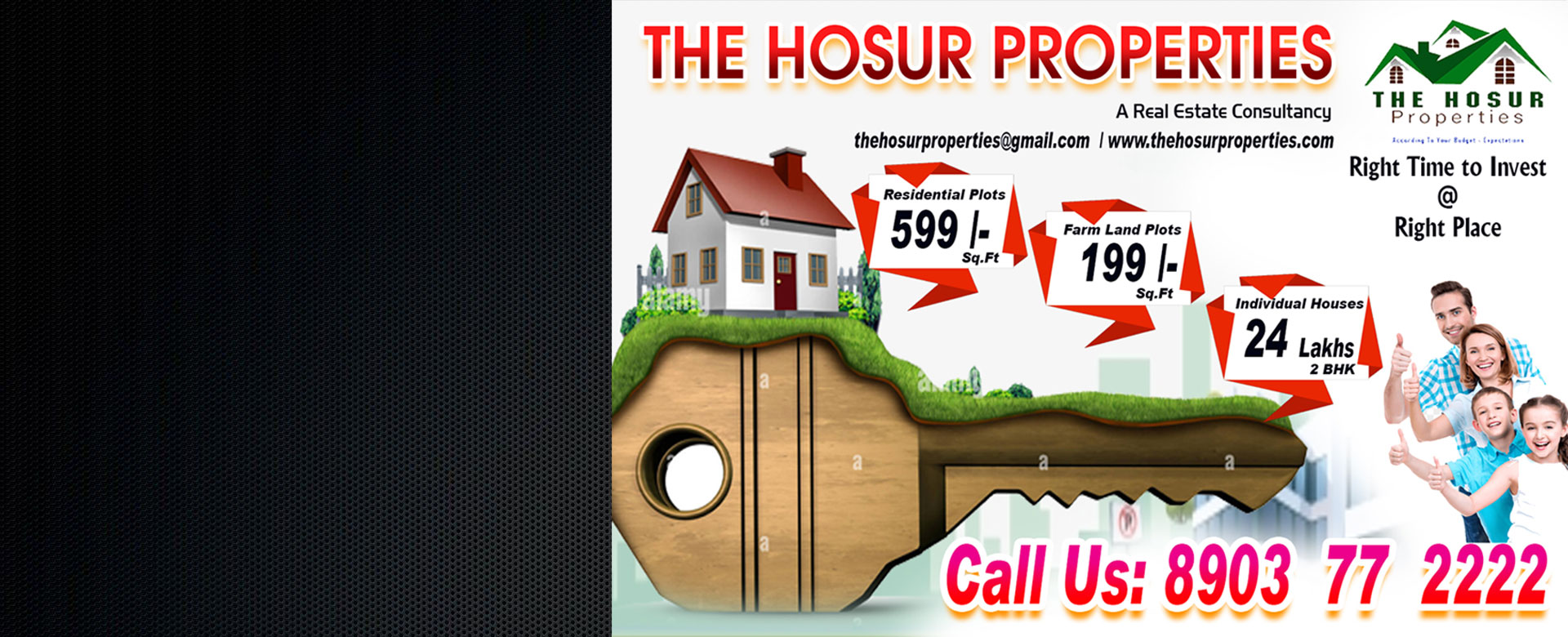 THE HOSUR PROPERTIES is Real Estate firm primarily into Residential Projects such as , VILLA’s ,Layouts and apartments for the past 5 years in Hosur, Krishnagiri, Tirupathur, Uthangarai, Dharmapuri and Bengaluru.